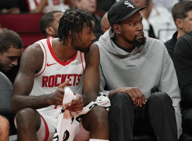 背靠背伊森也必须轮休,腹斜肌、膝盖、胫骨血栓轮番来袭。火箭管理层为何不愿为伊森开出5年1.25亿顶薪(与贾巴里·史密斯同价)?答案显而易见:耐久度不足以匹配顶薪风险。史密斯虽三分波动,但出勤率稳定,防守覆盖面广;伊森空有伦纳德模板,却染上“卡子病”。健康时,伊森是火箭攻防转换的加速器;伤停时,球队只能靠泰特或者杰夫格林去支撑侧翼。但即便伤病不断,火箭仍能以残阵碾压对手,核心在于杜兰特的统治级存在。